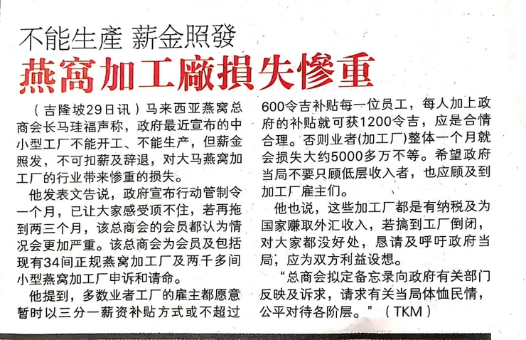 [Cannot produce, pay as much as possible] Bird's nest processing factory suffered heavy losses
